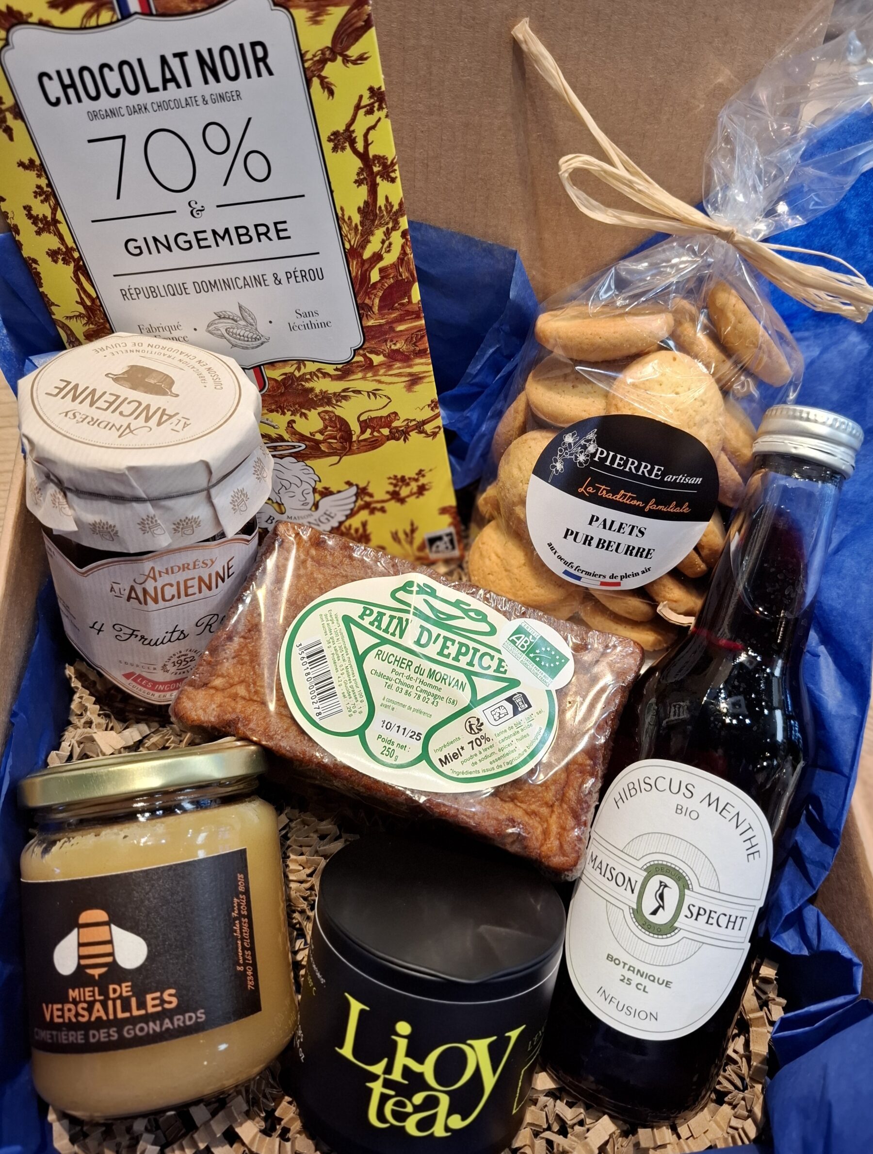 Ce coffret gourmand sucré comporte un pain d’épice du Morvan exceptionnel avec 70% de miel, du thé du 78, une tablette de chocolat Bonange fabriquée à Versailles, une boisson du 78, du miel de Versailles, des biscuits Pierre Artisan de buc et une confiture de Andrésy.