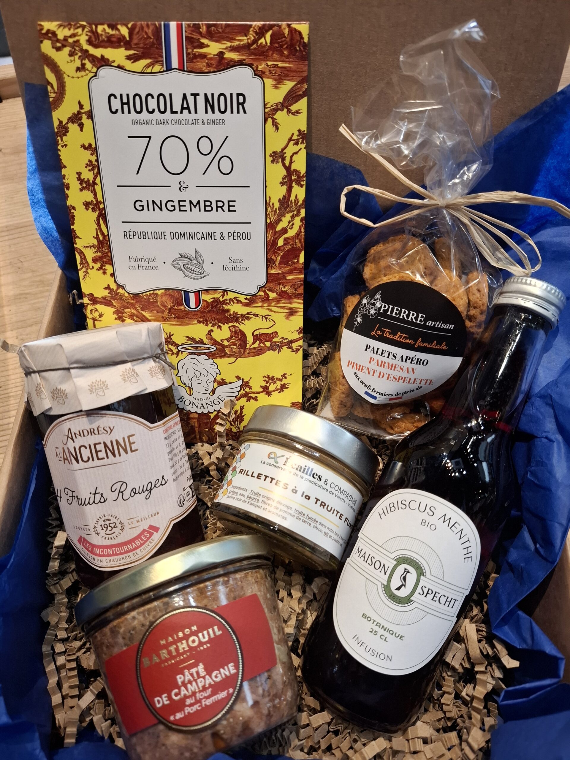 Ce coffret gourmand mixte comporte un pâté de la maison Barthouil, une boisson des Yvelines, des biscuits salés de Pierre Artisan fabriqués à Buc, une confiture de Andrésy (78), une tablette Bonange et des rillettes de truite de la pisciculture des Yvelines.