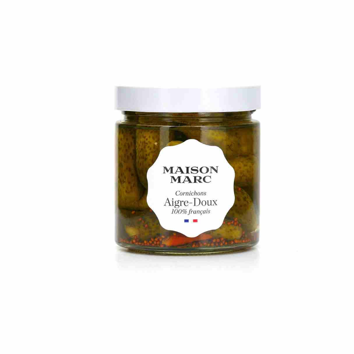 Les cornichons aigre doux de Maison Marc sont d’une jolie taille. Moins acides que les cornichons fins classiques, ils révèlent de nombreux arômes d’aneth et d’épices notamment. Ils plairont facilement au plus grand nombre grâce à la douceur apportée par le sucre.